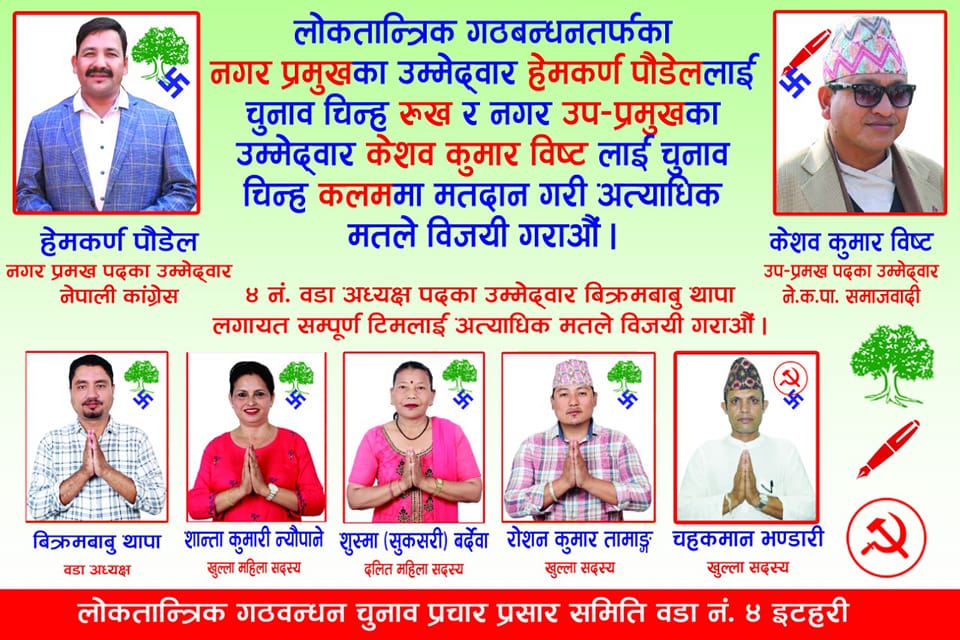 इटहरी : बैशाख ३० गते हुने स्थानीय तहको निर्वाचनमा इटहरी उपमहानगरपालिका वडा नं. ४ मा विक्रमबाबु थापा नेपाली कांग्रेसबाट वडाध्यक्षका उम्मेदवार छन् ।