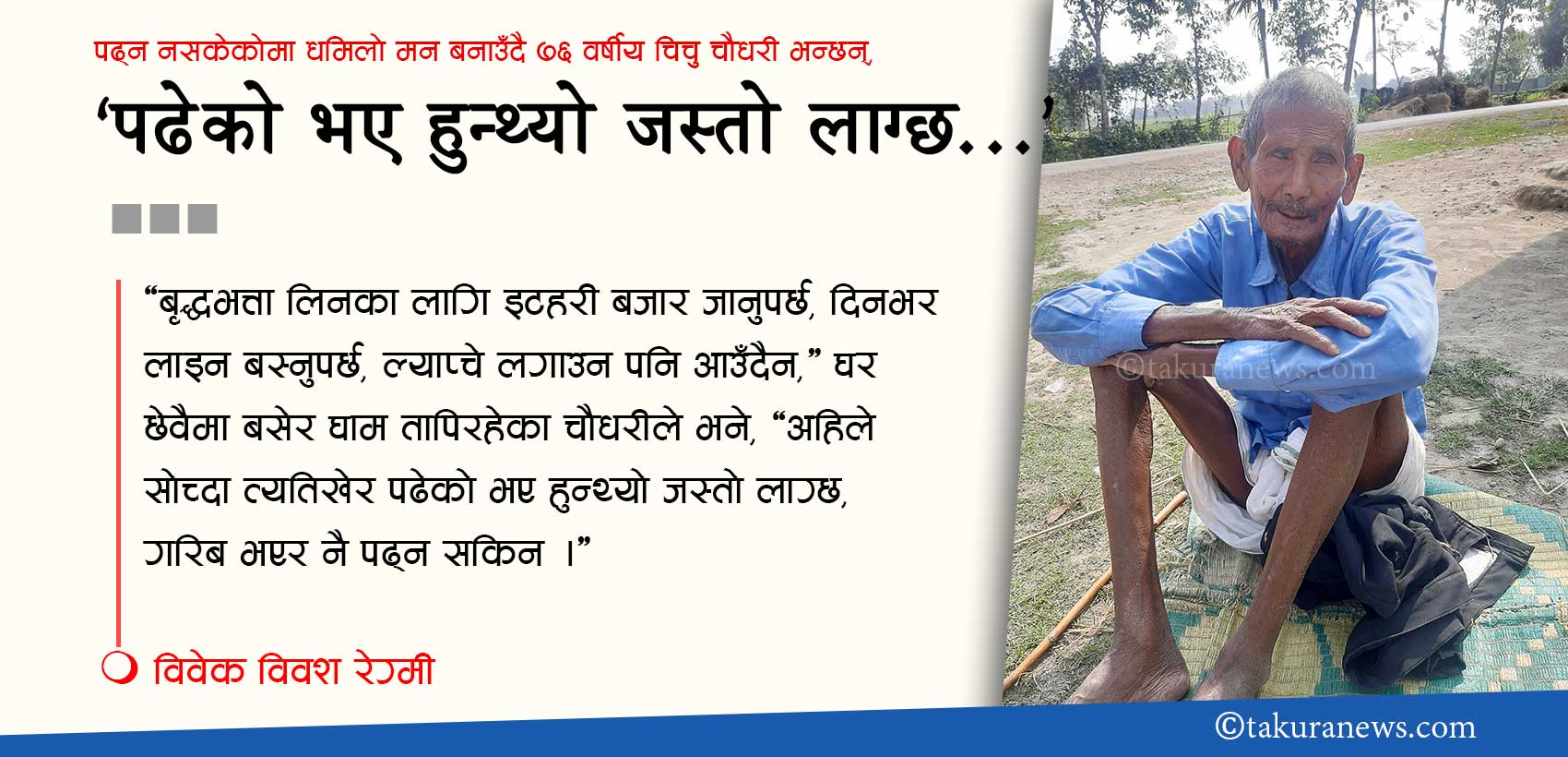 ‘बृद्धभत्ता लिनका लागि इटहरी जानुपर्छ, दिनभर लाइन बस्नुपर्छ, ल्याप्चे लगाउन पनि आउँदैन,’ घर छेवैमा बसेर घाम तापिरहेका चौधरीले भने, ‘अहिले सोची ल्याउँदा त्यतिखेर पढेको भए हुन्थ्यो जस्तो लाग्छ, गरिब मानिस पढ्न सकेन ।’