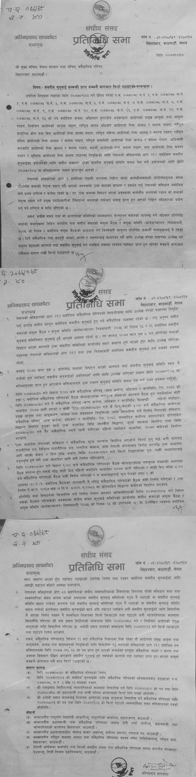 गत ५ पुसमा प्रधानमन्त्रीको सिफारिसमा राष्ट्रपतिले प्रतिनिधिसभा विघटन गरेसँगै अख्तियार, निर्वाचन आयोग लगायतका संवैधानिक अंगहरुमा नियुक्ति सिफारिस गरेको भन्दै संसद सचिवालयमा पत्र पुगेको थियो ।