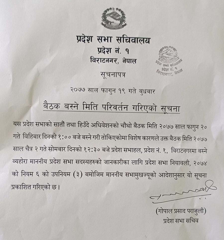 प्रदेश सभाका सचिव गोपालप्रसाद पराजुलीले बुधबार सूचना जारी गर्दै २० फागुनमा बोलाइएको बैठक विशेष कारणले स्थगित भएको जनाएका छन् । आगामी बैठकमा मुख्यमन्त्री राईविरुद्धको अविश्वास प्रस्तावमाथि छलफल हुनेछ ।