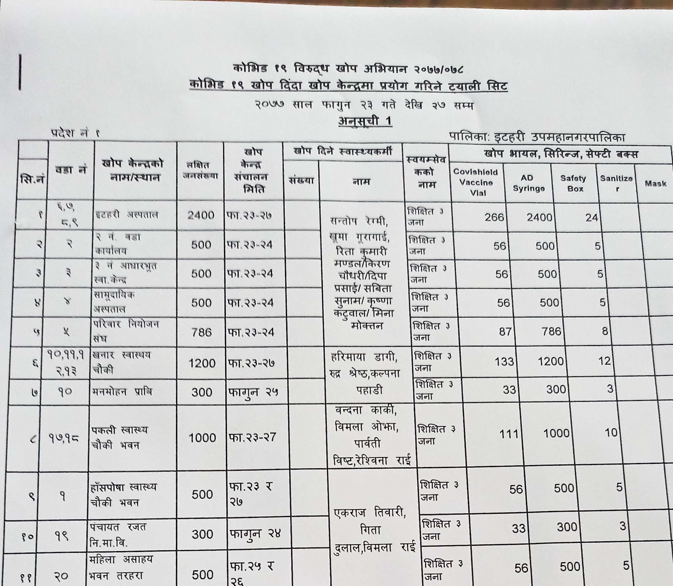 वडा नम्वर १४ देखि १६ का लागि एकम्वा स्वास्थ्य चौकीमा फागुन २३ देखि २७ गते सम्म, वडा नम्वर १ को हाँसपोसा स्वास्थ्य चौकी भवनमा फागुन २३ र २७ गते, वडा नम्वर १९ को पञ्चालयत रजत निमाविमा फागुन २४ गते र वडा नम्वर २० को महिला असहाय भवन तरहरामा फागुन २५ र २६ गते खोप लगाउने कार्यक्रम रहेको इटहरी उपमहानगरपालिकाले जनाएको छ ।