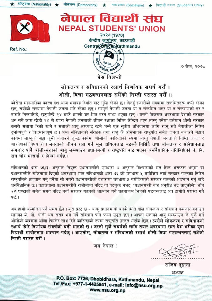 ‘कोरोना महामारीका कारण देश आज भयावह स्थितिमा गुज्रिरहेको छ । नेपाली जनताको जीवन रक्षाका निम्ति केन्द्रित भएर लाग्नुपर्नेमा वर्तमान ओली सरकार कसरी सत्तामा टिकि रहने र सत्ताको आयू लम्व्याई रहने भन्ने एक सुत्रीय अभियानमा लागि रहनु सबै नेपालीका निम्ति दुर्भाग्यपूर्ण र विडम्वनापूर्ण छ,’ सभापति ढुंगानाद्धारा जारी विज्ञप्तिमा भनिएको छ, ‘अझ संविधानको संरक्षक तथा राष्ट्रकै अभिभावक राष्ट्रपति समेत जनता बचाउने महान कार्यमा लाग्नुको सट्टा कुर्सी बचाउने तुच्छ कार्यमा ओलीको कारिन्दाको रुपमा लाग्नु नेपाली जनताको निम्ति लज्जा र आक्रोशको विषय हो ।’