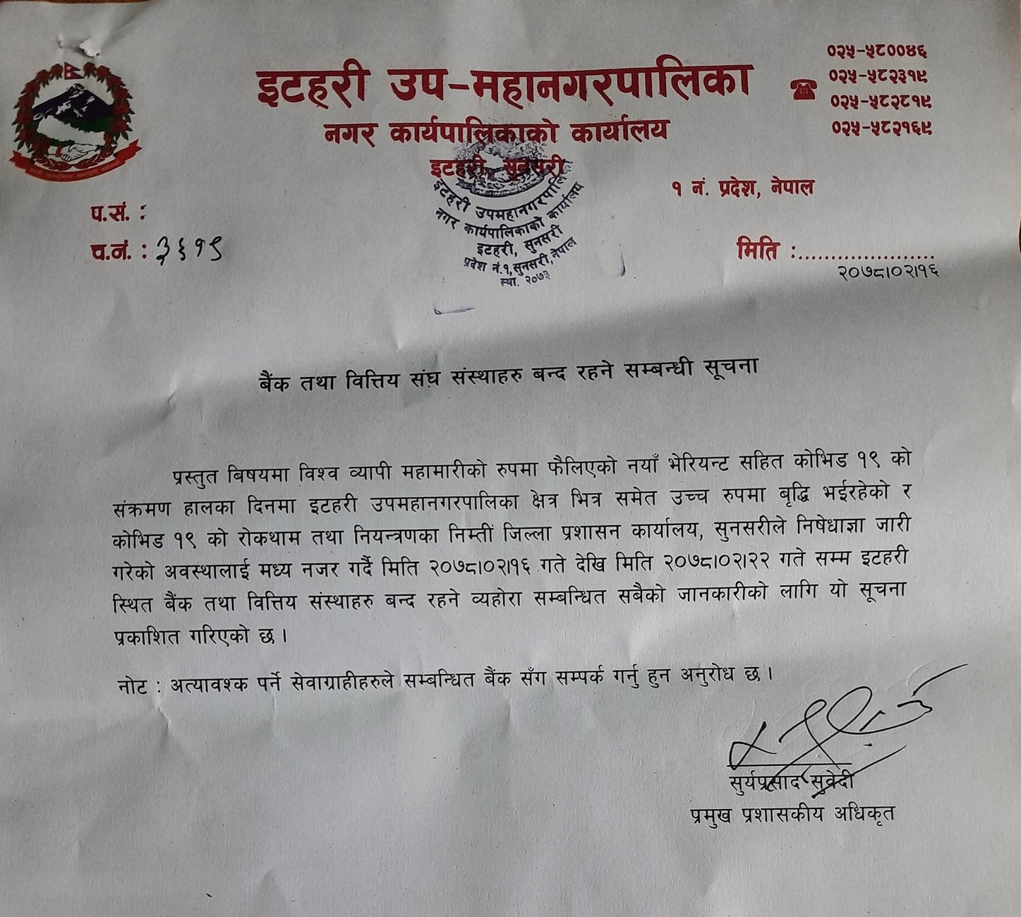 इटहरी : इटहरी उपमहानगरपालिका क्षेत्रमा रहेका सबै बैँक तथा वित्तिय संस्था जेठ २२ गतेसम्म बन्द हुने भएको छ ।
