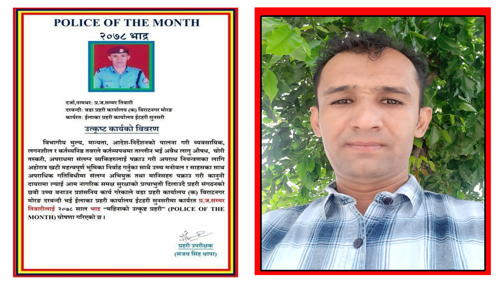 प्रहरी संगठनभित्र रहेर अपराध नियन्त्रण तथा समाजमा शान्ति सुरक्षा कायम गर्ने सवालमा अब्बल भूमिका निर्वाह गरेको भन्दै इटहरी प्रहरीका जवान पदमा कार्यरत तिवारीलाइ भदौ महिनाको ‘पुलिस अफ द मन्थ’उपाधिबाट सम्मान गरिएको हो ।