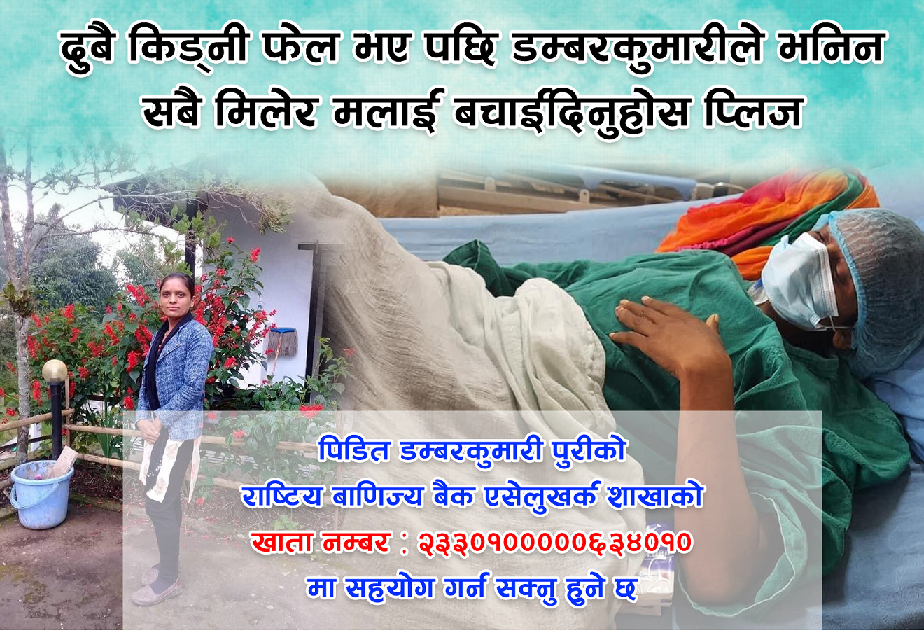पीडित डम्बरकुमारी पुरीको राष्ट्रिय बाणिज्य बैँक एसेलुखर्क शाखाको खाता नम्बर २३३०१०००००६३४०१० मा सहयोग गर्न सकिने साथै ९८४२७३९४२५ नम्बरमा समेत कुरा गर्न सकिने परिवारजनले बताएका छन् ।