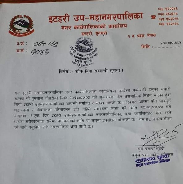 इटहरी उपमहानगरका एक कर्मचारीको निधन, आइतबार शोक विदा