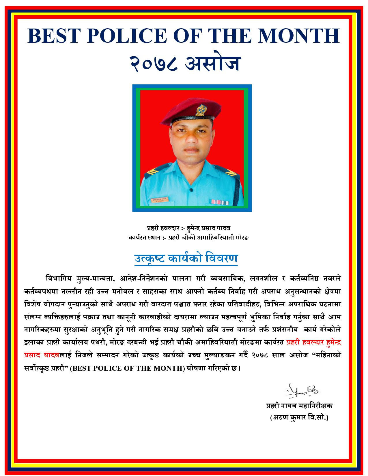 विभागिय मुल्य–मान्यता, आदेश–निर्देशनको पालना गरी व्यवसायिक, लगनशील र कर्तव्यनिष्ठ तवरले कर्तव्यपथमा तल्लीन रहेर उच्च मनोवल र साहसका साथ आफ्नो कर्तब्य निर्वाह गरी अपराध अनुसन्धानको क्षेत्रमा विशेष योगदान पुर्याउनुको साथै अपराध गरी वारदात पश्चात फरार रहेका प्रतिवादीहरु, विभिन्न अपराधिक घटनामा संलग्न व्यक्तिहरुलाई पक्राउ तथा कानूनी कारवाहीको दायरामा ल्याउन महत्वपूर्ण भुमिका निर्वाह गर्नुका साथै आम नागरिकहरुमा सुरक्षाको अनुभूति हुने गरी नागरिक समक्ष प्रहरीको छवि उच्च बनाउने तर्फ प्रशंसनीय कार्य गरेकाले इलाका प्रहरी कार्यालय पथरी, मोरङ दरबन्दी भई प्रहरी चौकी अमाहिबरियाती मोरङमा कार्यरत प्रहरी हवल्दार हुमेन्द्र प्रसाद यादवलाई उनले गरेको उत्कृष्ट कार्यसम्पादनको उच्च मुल्याङकन गर्दै २०७८ साल असोज “महिनाको सर्वोत्कृष्ट प्रहरी (BEST POLICE OF THE MONTH) घोषणा गरिएको छ ।
