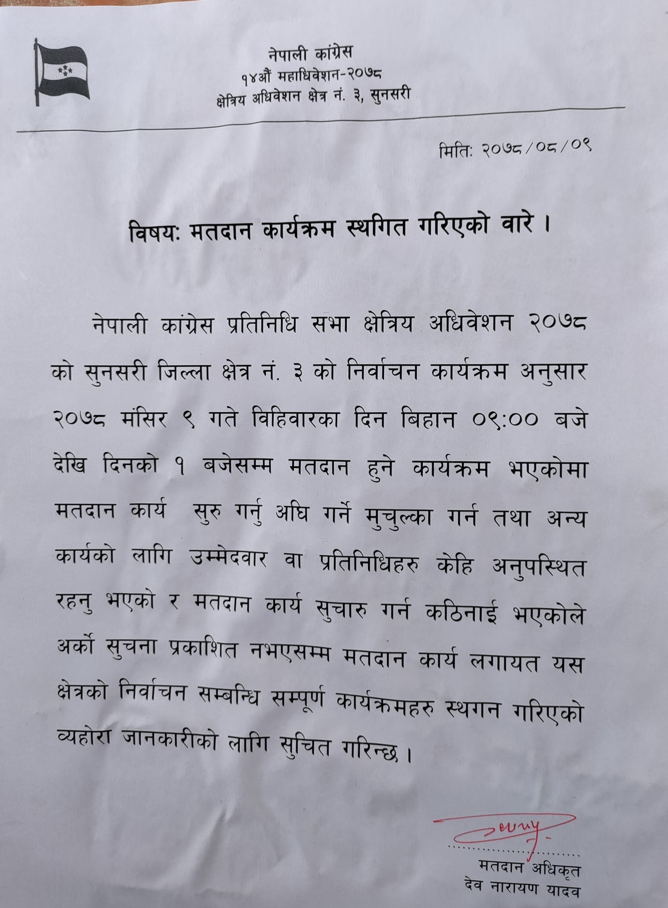 बिहीबार साँझ एक सूचना जारी गर्दै निर्वाचन अधिकृत देवनारायण यादवले प्रतिनिधिहरू अनुपस्थित भएकाले निर्वाचन गर्न कठिनाई भएको भन्दै अर्को सूचना प्रकाशित नभएसम्म मतदान कार्य स्थगित गरिएको जानकारी गराएका हुन् ।