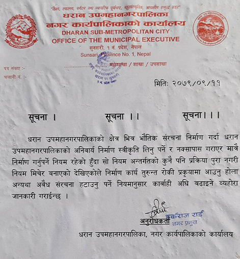 ‘धरान उपमहानगरपालिकाको क्षेत्रभित्र भौतिक संरचना निर्माण गर्दा धरान उपमहानगरपालिकाको अनिवार्य निर्माण स्वीकृति लिनु पर्ने र नक्सा पास गराएर मात्रै निर्माण गर्नु पर्ने नियम रहेको हुँदा सो नियम अन्तर्गतको कुनै पनि प्रक्रिया पूरा नगरी नियम मिचेर बनाएको देखिएकाले निर्माण कार्य तुरुन्त रोकी प्रक्रियामा आउनु होला, अन्यथा अवैध संरचना हटाउनु पर्ने नियमानुसार कारबाही अघि बढाइने ब्यहोरा जानकारी गराइन्छ ।’ सूचनामा भनिएको छ ।