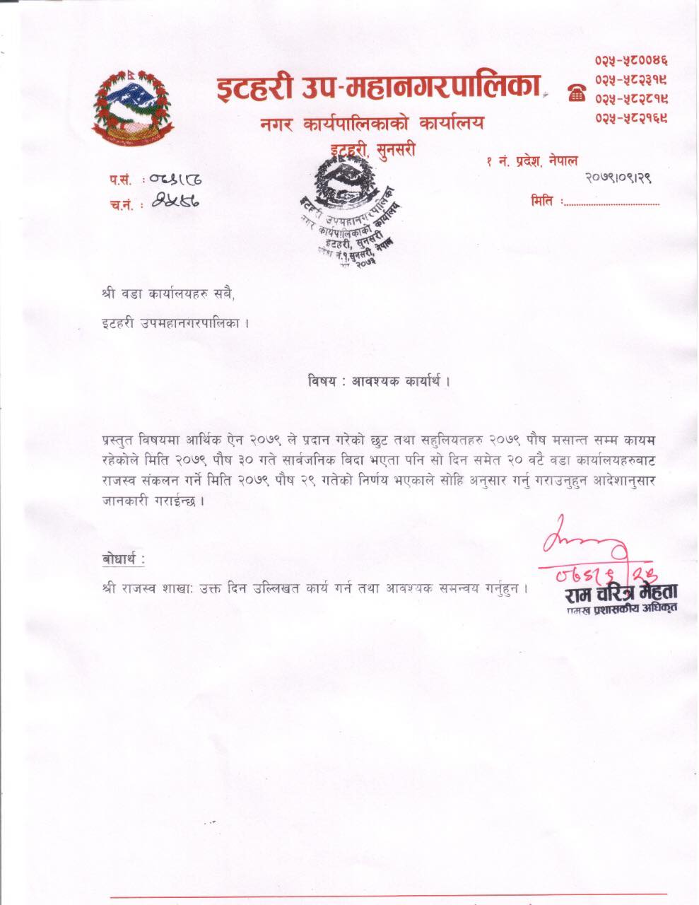 छुट तथा सहुलियत पुस मसान्त सम्म कायम रहेकाले शनिवार पनि राजस्व संकलन गर्नका लागि सवै वडामा राजश्व संकलन जारी राख्ने इटहरी उपमहानगरका प्रमुख प्रशासकीय अघिकृत रामचरित्र मेहेताले एक सूचना जारी गरेर बताएका छन् ।