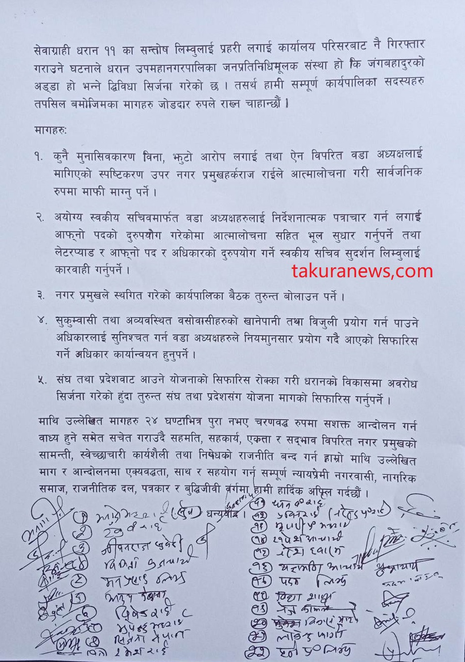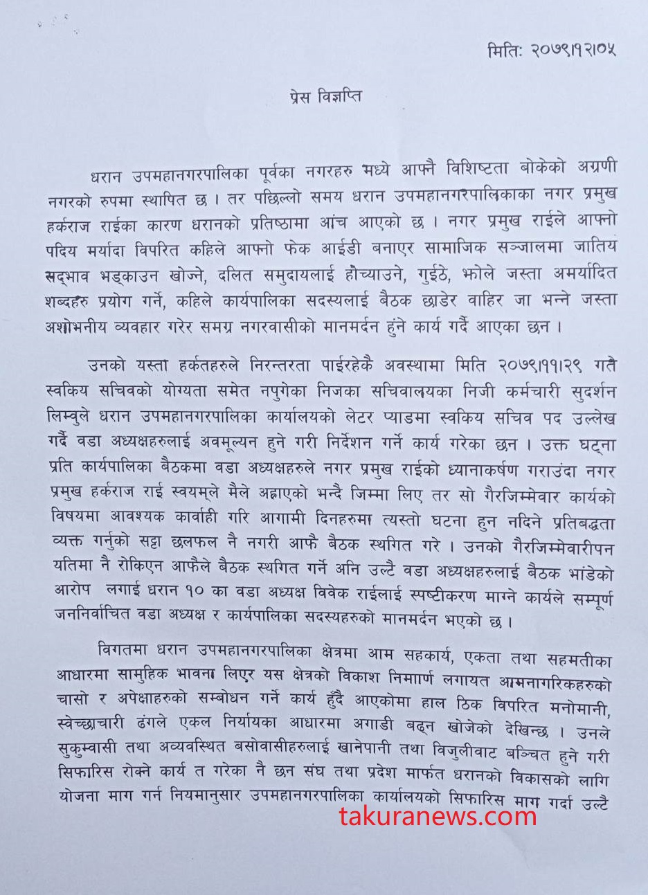 बहुमत वडाध्यक्षहरूलगायत धरान कार्यपालिका सदस्यहरूले संयुक्त हस्ताक्षरसहित प्रेस विज्ञप्ति जारी गर्दै मेयरले २४ घण्टाभित्र क्षमायाचना नगरे आफूहरू चरणबद्ध रूपमा आन्दोलनमा जाने चेतावनी दिएका छन्।