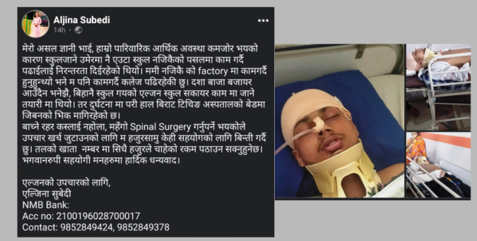 ‘बिहानको समयमा कक्षा थियो, त्यसैबेला अमलाको रुखबाट लडेर घाइते भएछन्’ राईले भने, ‘हामीले हस्पिटलसम्म पुर्यायौँ, पहिलो दिनको औषधि खर्च पनि तिरेका थियौँ, स्कूलबाट सहयोग गर्ने कुनै स्रोत नहुँदा पनि समस्या भएको छ ।’