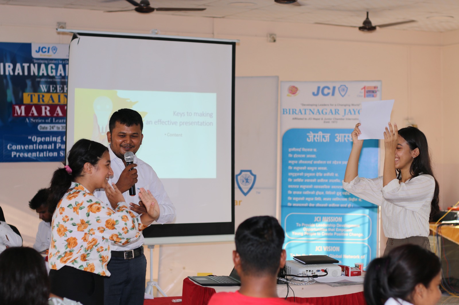 विराटनगर : विराटनगर जेसीजको आयोजनामा साताब्यापी तालिम सप्ताह सुरु भएको छ । पहिलो दिनको कार्यक्रम पब्लिक स्पिकिङ र प्रेजेन्टेसन स्किल तालिम सम्पन्न भएको छ ।