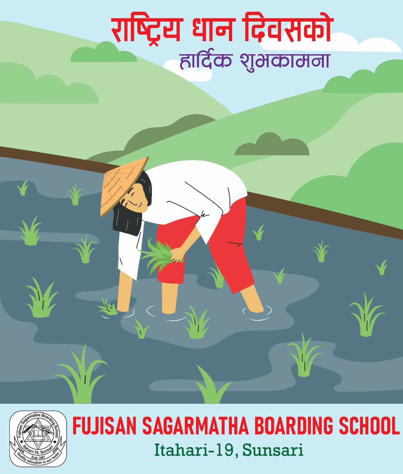 शुक्रबार (आज) इटहरी १९ मा रहेको फुजीसान सगरमाथा बोर्डिङ स्कूलमा अध्ययनरत विद्यार्थीहरूले धान दिवसको अवसर पारेर रोपाईँ गरेका छन् । प्रयोगात्मक सिकाईलाई प्राथमिकतामा राख्दै विद्यार्थीहरूलाई धान रोपाईँमा जोडिएको विद्यालयले जनाएको छ ।