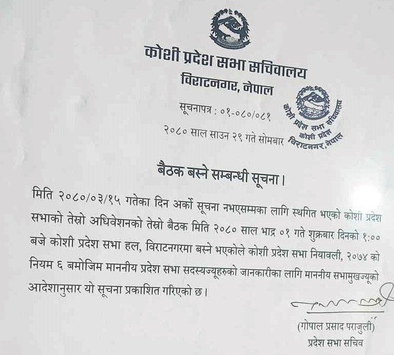 प्रदेशसभा सचिवालयका सचिव गोपालप्रसाद पराजुलीले सूचना प्रकाशित गर्दै भदौ १ गते प्रदेशसभा बैठक बस्ने जानकारी दिए ।