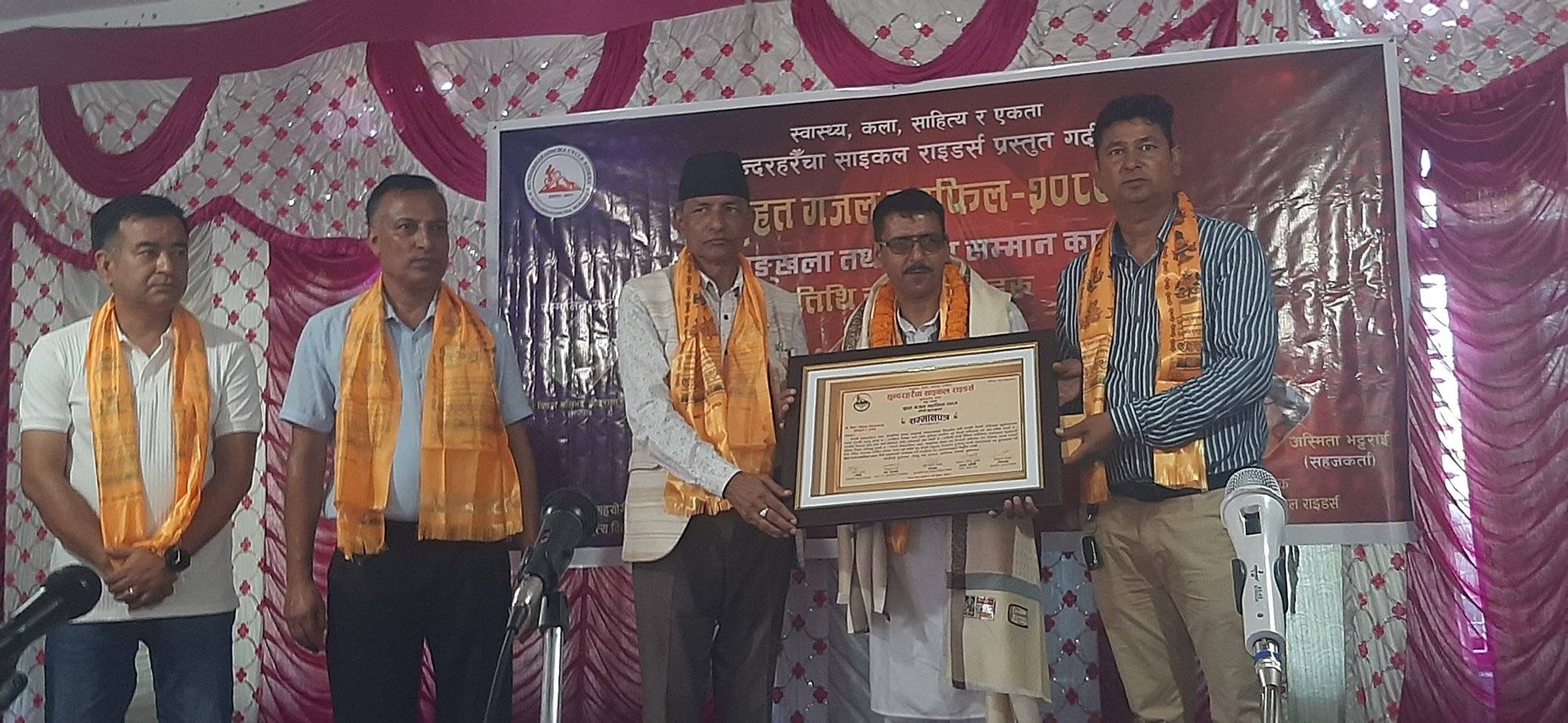 सुन्दरहरैँचा साइकल राइडर्सले आयोजना गरेको ‘बृहत् गजल महफिल’मा गजलकार विवश बलिभद्र कोइरालालाई सम्मानसमेत गरियो । उनलाई कार्यक्रमका प्रमुख अतिथि प्रदेश सांसद ज्ञानेन्द्र सुवेदीले सम्मान गरे ।