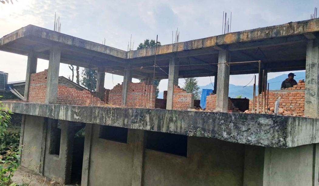 भुईँतलाको पर्खालमा प्लास्टर गरिसकिएको भवनको माथिल्लो तलामा भने पर्खाल नै निर्माण भएको छैन ।