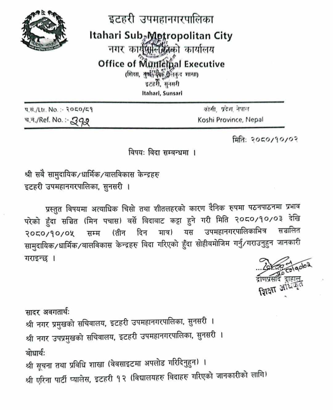 इटहरी : इटहरी उपमहानगरपालिकाले नगर क्षेत्रभित्र सञ्चालित शैक्षिक संस्था तीन दिन बिदा दिने निर्णय गरेको छ ।