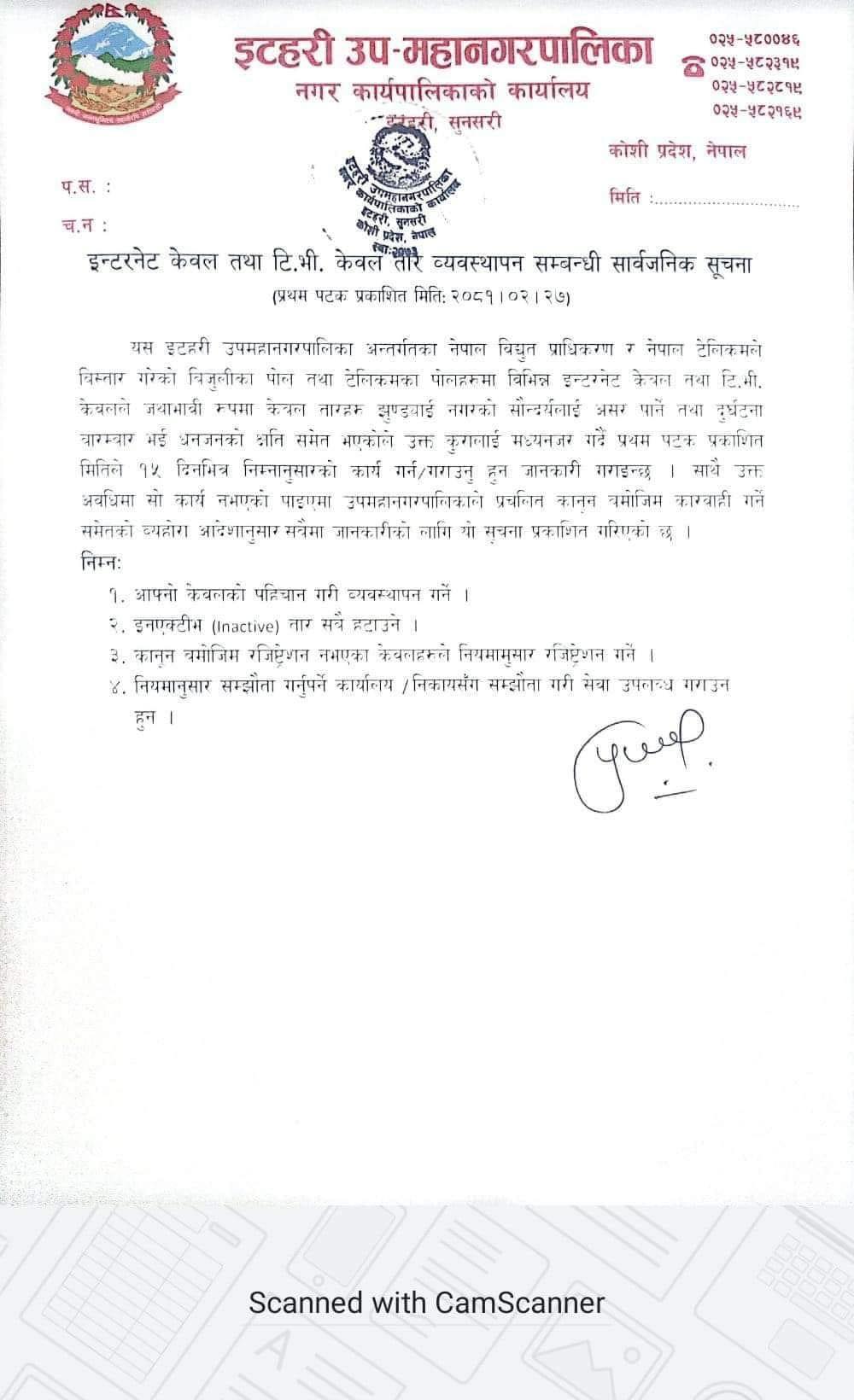इटहरी : इटहरी उपमहानगरपालिकाले नगर क्षेत्रका सडक छेउमा अव्यवस्थित लत्रिएका केवल र इन्टरनेटको तार व्यवस्थापन गर्न पत्राचार गरेको छ ।