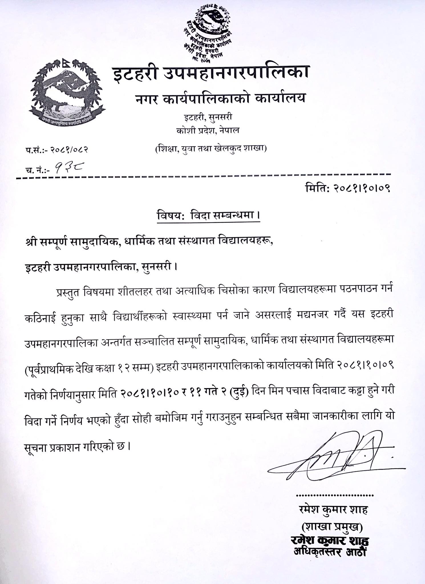 बुधबार एक सूचना जारी गर्दै इटहरी उपमहानगरपालिकाले बिहीबार र शुक्रबार बिदा दिएको हो ।