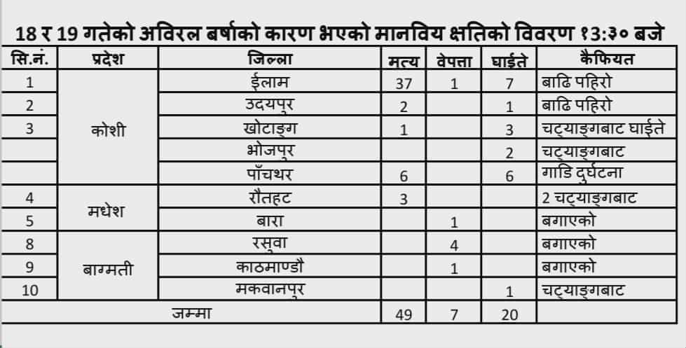 इटहरी : अविरल वर्षासँगै आएको बाढीपहिरोमा परी अहिलेसम्म देशभर ४९ जनाको मृत्यु भएको छ ।