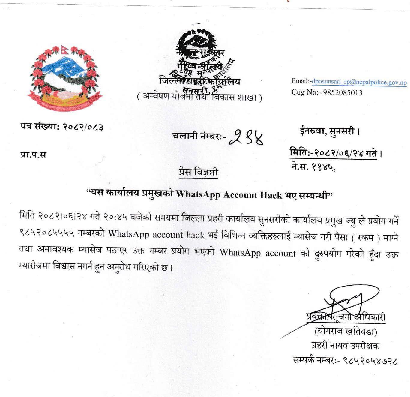 जिल्ला प्रहरी कार्यालयका प्रवक्ता डीएसपी योगराज खतिवडाले एक सूचना जारी गर्दै भनेका छन्, “जिल्ला प्रहरी कार्यालय सुनसरीको कार्यालय प्रमुख ज्यूले प्रयोग गर्ने ९८५२०८५५५५ नम्बरको ह्वाट्सएप एकाउन्ट ह्याक भई विभिन्न व्यक्तिहरूलाई म्यासेज गरी पैसा (रकम) माग्ने तथा अनावश्यक म्यासेज पठाएर उक्त नम्बर प्रयोग भएको ह्वाट्सएप एकाउन्टको दुरुपयोग गरेको हुँदा उक्त म्यासेजमा विश्वास नगर्न हुन अनुरोध गरिएको छ ।”