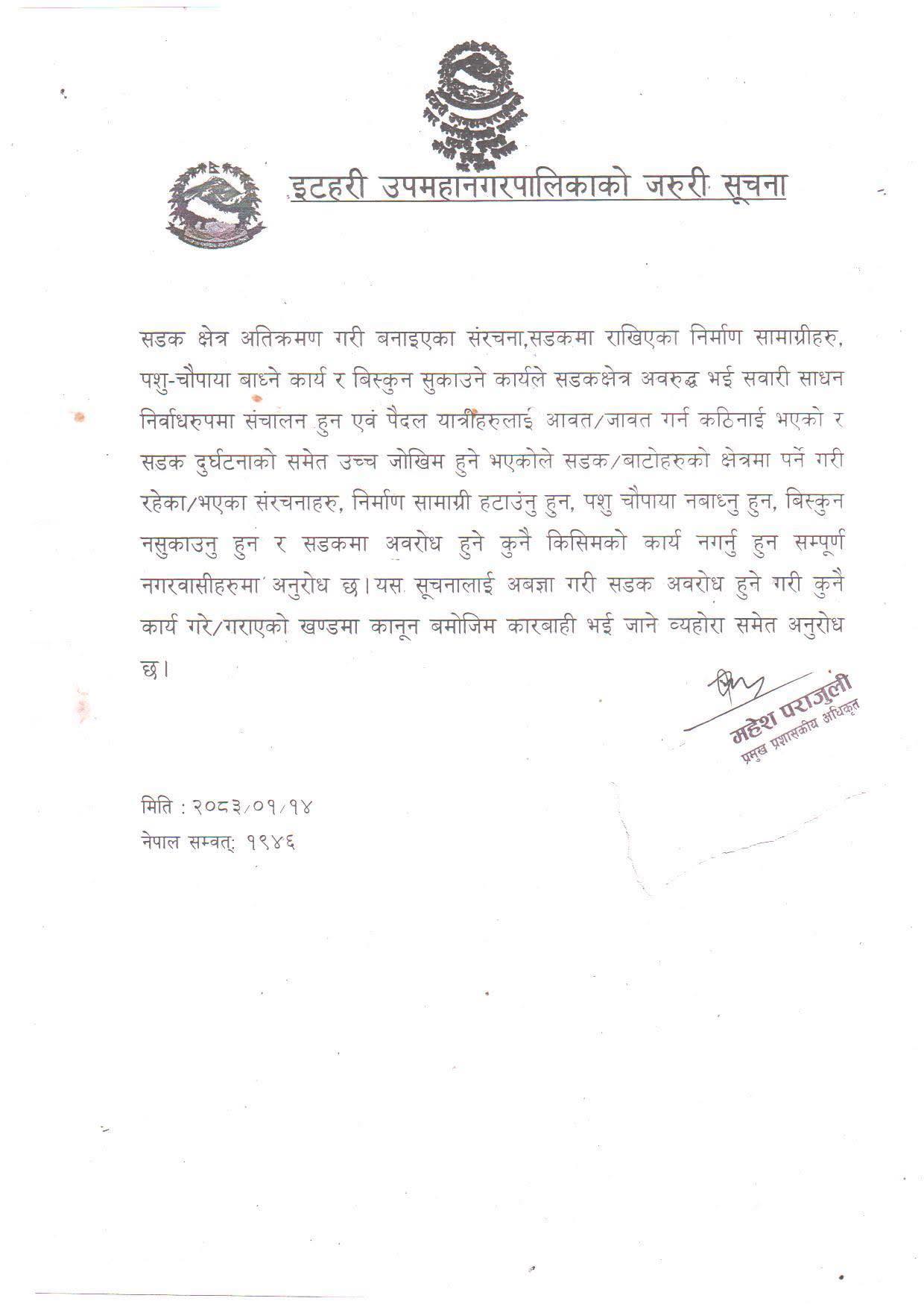 इटहरी : इटहरी उपमहानगरपालिकाले सडक क्षेत्र अतिक्रमण रोक्न एक सूचना जारी गरेको छ।