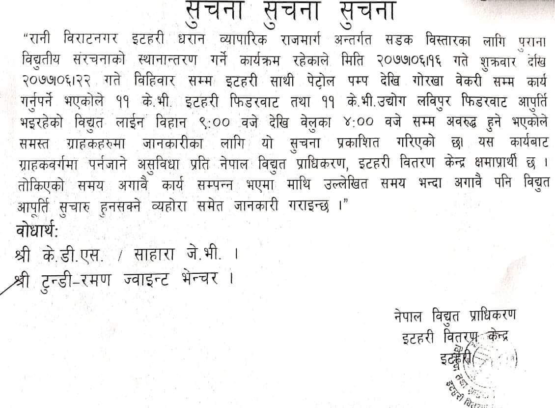 इटहरीको साथी पेट्रोल पम्प देखि गोरखा बेकरी सम्म बाटो बिस्तार गर्नुपर्ने र पोल सार्नुपर्ने भएकाले ११ केभि इटहरी फिडवारबाट तथा ११ केभि उद्योग लबिपुर फिडवारबाट आपूर्ती भएका बिद्युत बिहानको ९ बजेबाट बेलुका ४ बजे सम्म आवरुद्ध हुने जनाएको छ ।