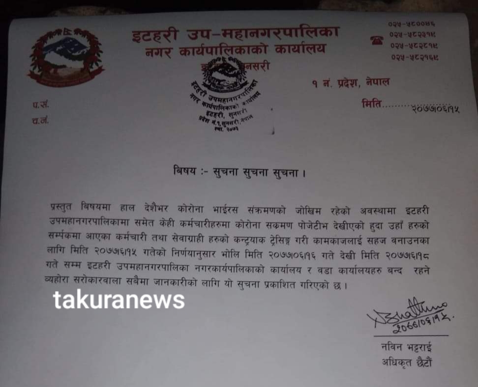 कोरोना भाइरसको संक्रमण बढ्दै गएको र उपमहानगरपालिकाकै कर्मचारीहरुमा कोरोना संक्रमण देखिएपछि भोलि १६ गतेदेखि १८ गतेसम्म इटहरी उपमहानगरपालिका र वडा कार्यालयहरु बन्द गरिने सूचना जारी गरिएको छ ।