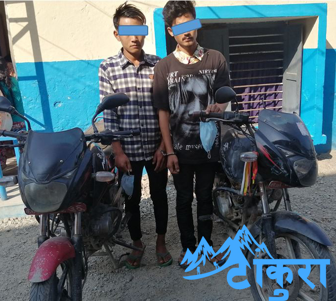 को १८ प ८५३६ र को. ७ प ९६२५ न. को मोटरसाईकल चोरी गरेको आरोपमा दुईजनालाई प्रहरीले पक्राउ गरेको हो ।