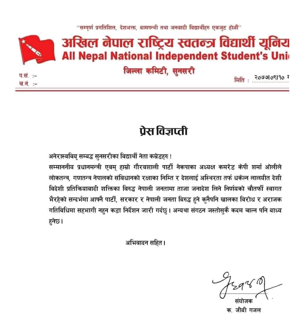 प्रधानमन्त्री तथा नेकपाका अध्यक्ष केपी शर्मा ओलीले संसद विघटन गरेपछि उत्पन्न पछिल्ला विरोध तथा अराजक गतिबिधिमा सहभागी नहुन अनेरास्ववियू सुनसरीले निर्देशन दिएको छ ।