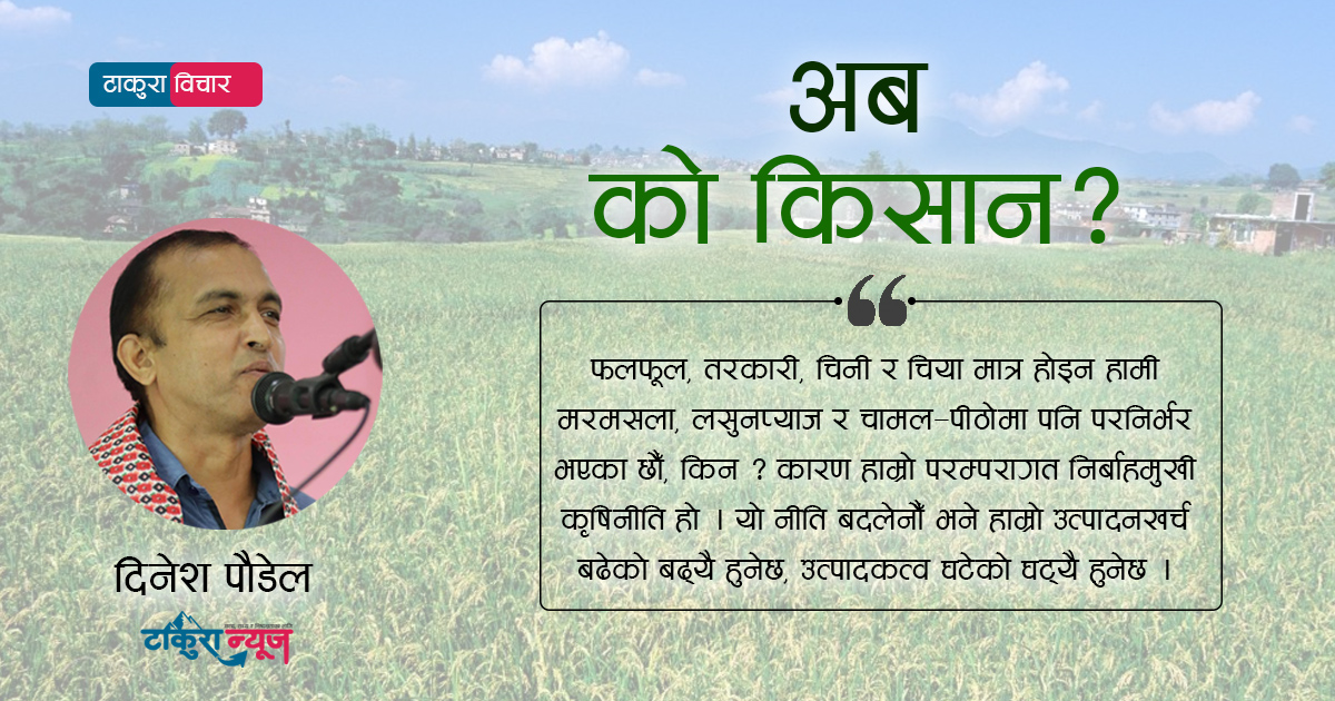 यता हाम्रा खेतबारी बाँझिँदै जानेछन् र उता अर्जेन्टिनामा फलेको मुरली मकै, भारतमा फलेको चामल-पीठो र थाइल्यान्डको वनमा उम्रने थाकलको खरेटाले हाम्रा किसानको उत्पादनलाई विस्थापन गर्दै जानेछ ।