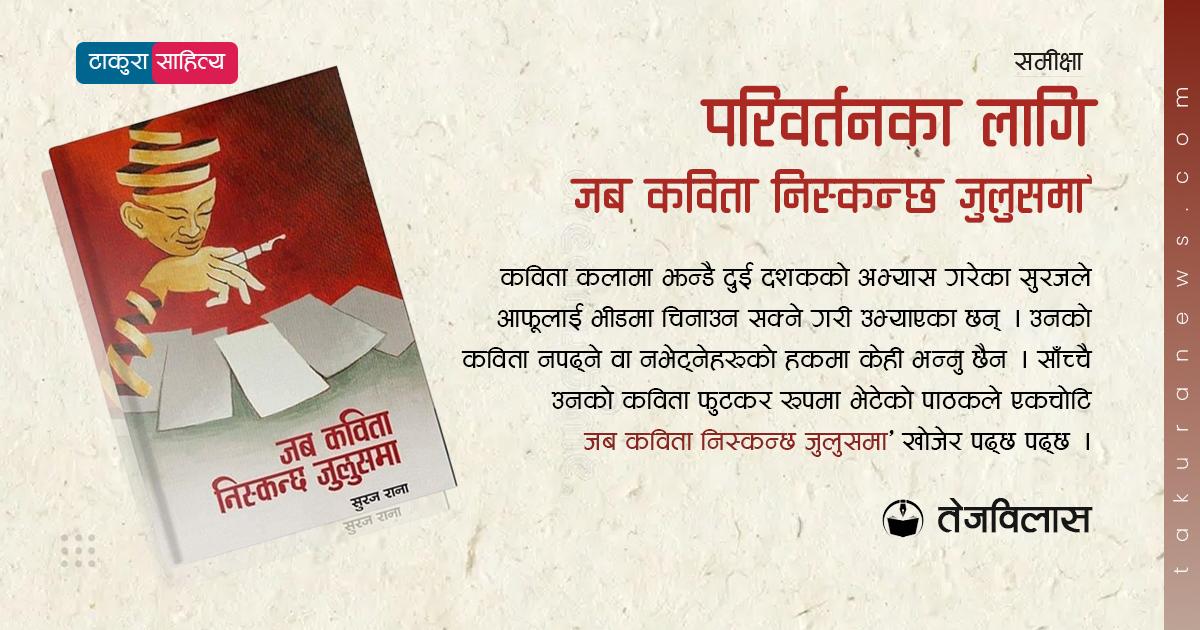 माथि प्रस्तुत गरिएका कविताशं कवि सुरज रानाको ‘जब कविता निस्कन्छ जुलुसमा’ २०८१ कविता सङ्ग्रहभित्र सङ्ग्रहित ‘परिवर्तन’ शीर्षकको कविताबाट लिइएको हो ।