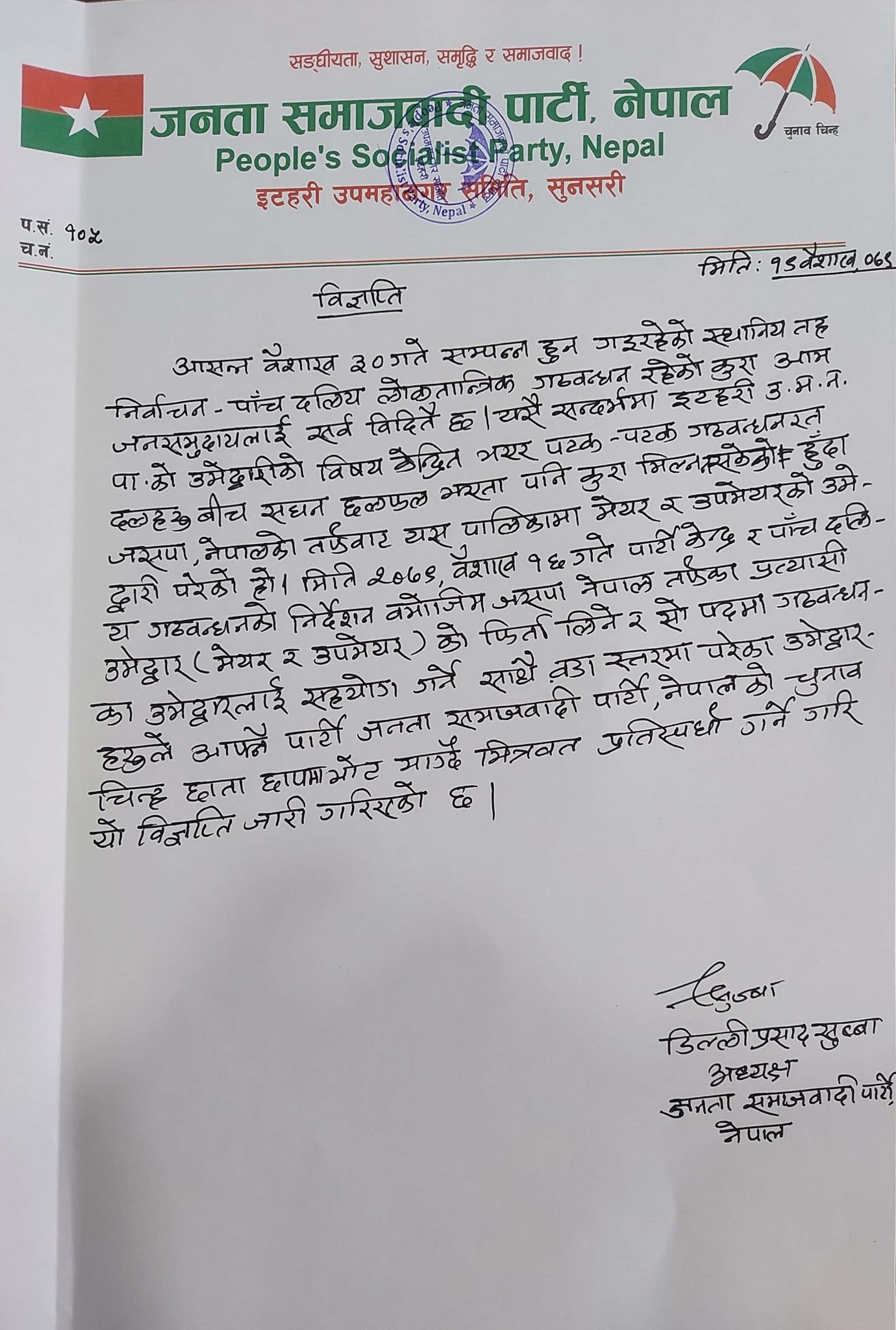 जसपाले दुवै जनाको उम्मेदवारी फिर्ता लिने निर्णय गरेको छ । जसपाले मेयर र उपमेयरमा दिएको उम्मेदवारी फिर्ता लिँदै गठबन्धनका उम्मेदवारलाई सघाउने र वडा तहमा भने मित्रवत् प्रतिस्पर्धा गर्ने निर्णय गरेको छ ।