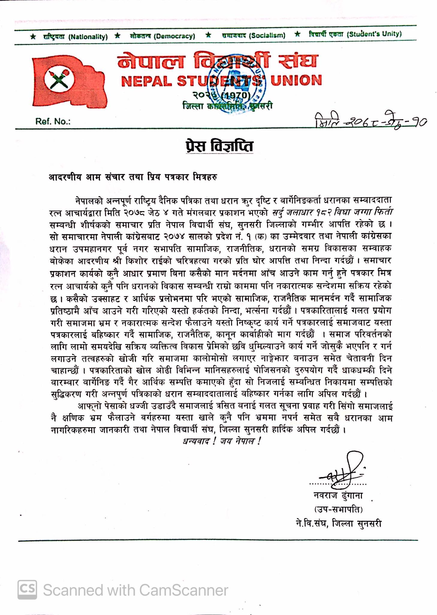 एक विज्ञप्ति जारी गर्दै नेविसंघ सुनसरीका उपसभापति नवराज ढुंगानाले गलत समाचार प्रकाशित गरेकाले आपत्ति जनाएका हुन् ।