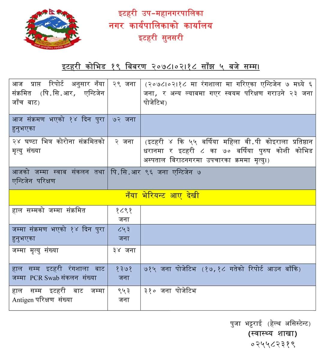 इटहरी उपमहानगरपालिका स्वास्थ्य शाखाका अनुसार मंगलबार साँझसम्म प्राप्त रिपोर्टअनुसार कुल मृतकको संख्या ३४ पुगेको हो ।