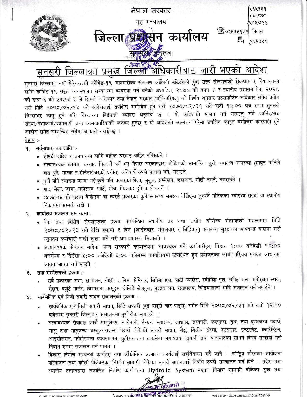 इटहरी : सुनसरी जिल्लामा जेठभर निषेधाज्ञा थप गर्ने निर्णय भएको छ । कोरोना संक्रमण बढ्दै गएकाले जिल्लामा पुनः एक साताका लागि निषेधाज्ञा थपिएको हो ।
