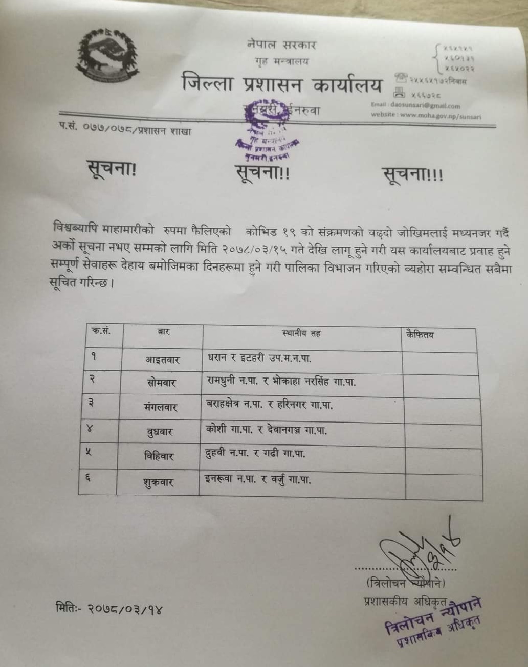 इटहरी : जिल्ला प्रशासन कार्यालय सुनसरीले अब बारअनुसार सेवा प्रवाह गर्ने भएको छ ।