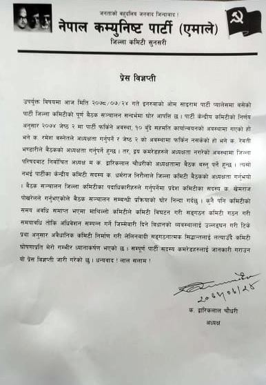 एमाले सुनसरी इन्चार्ज धर्म निरौलाको अध्यक्षतामा गरिएपछि चौधरीले विधान विपरीत भएको भन्दै बुधबार बोल्ने क्रममै माइक खोसेका थिए ।