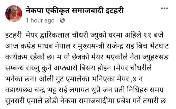 नेकपा एस इटहरी नगर कमिटीको फेसबुक अकाउन्टबाट मेयर चौधरी र इटहरी ४ का वडाध्यक्ष चन्द्र भट्टराईको टोली नेकपा एसमा प्रवेश गर्ने लेखिएसँगै एमालेमा तरङ्ग छाएको नेताहरू बताउँछन् ।