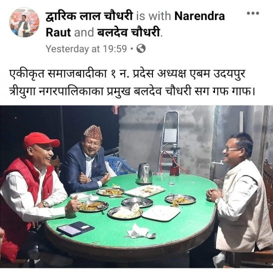 यसअघि एकीकृत समाजवादीका १ नम्बर प्रदेश अध्यक्ष एवम् उदयपुर त्रियुगा नगरपालिकाका मेयर बलदेव चौधरीसँग पनि भेटघाट गरेर उनकै घरमा खानपिनको कार्यक्रम राखेको तस्वीर तथा भिडियो उनै मेयर चौधरीले सार्वजनिक गरेका थिए ।