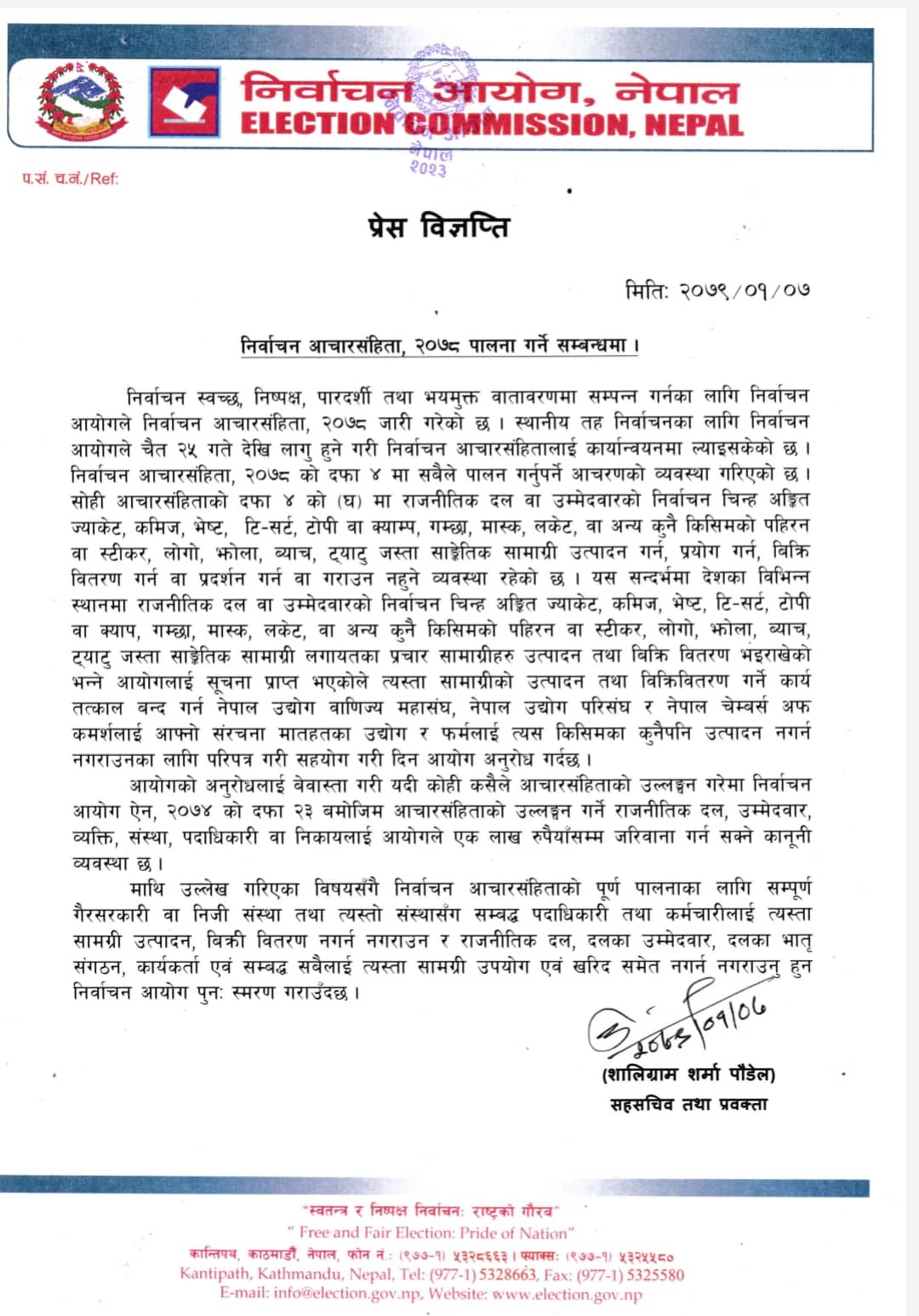 आसन्न स्थानीय तह निर्वाचनका लागि आचारसंहिता लागू भइसकेकाले राजनीतिक दलले निर्वाचन चिह्नअंकित ज्याकेट, टिसर्ट लगायतका प्रचार सामग्री प्रयोग गरिरहेको सूचना आएको भन्दै त्यस्तो कार्यलाई रोक्न आग्रह गरेको छ।