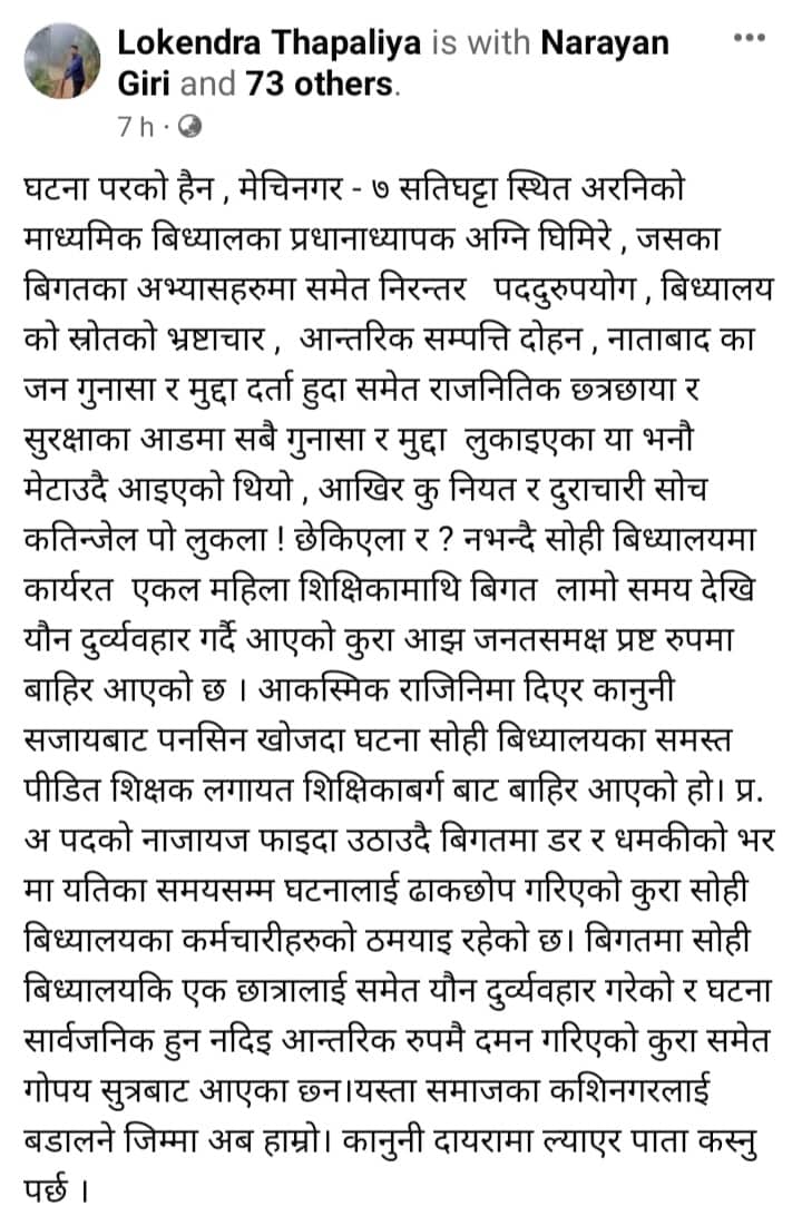 सहकर्मी एकल महिला शिक्षिकामाथि यौन दुर्व्यवहार गरेको घटना सार्वजनिक हुने र कानूनी सजाय भोग्नुपर्ने डरले घिमिरेले पद र पेसाबाटै बुधबार राजीनामा दिएका हुन् ।