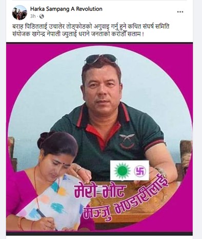 जहाँ मञ्जु भण्डारीलाई भोट माग्दै गरेको खेमराज नेपालीको फोटो राखिएको थियो । मेयर साम्पाङले बराह बचतको विषयलाई लिएर एमाले कार्यकर्ताले पीडितलाई उचालेको भन्दै फेसबुक पोस्ट गरेका थिए ।