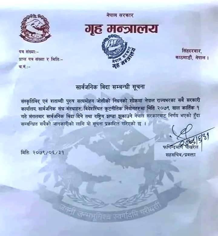 शताब्दी पुरुष सत्यमोहन जोशीको निधन भएकामा गृह मन्त्रालयले शोक विदा दिने निर्णय गरेको हो ।
