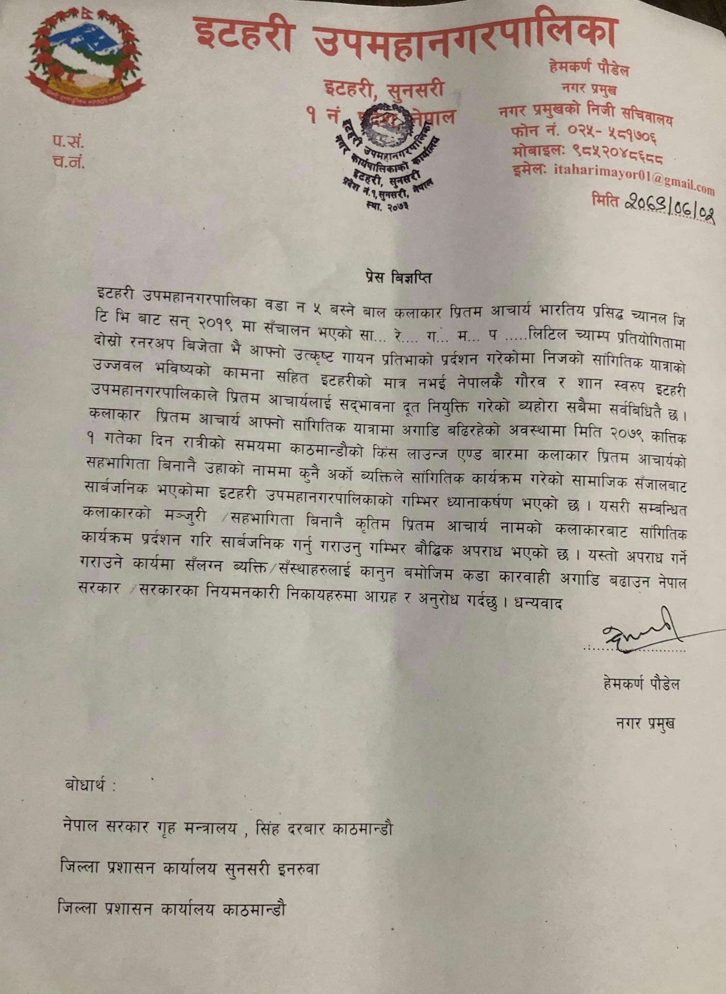 मेयर हेमकर्ण पौडेलले एक प्रस विज्ञप्ती जारी गर्दै प्रीतमको बौद्विक चोरी भएकोमा आपत्ति जनाएका छन् ।