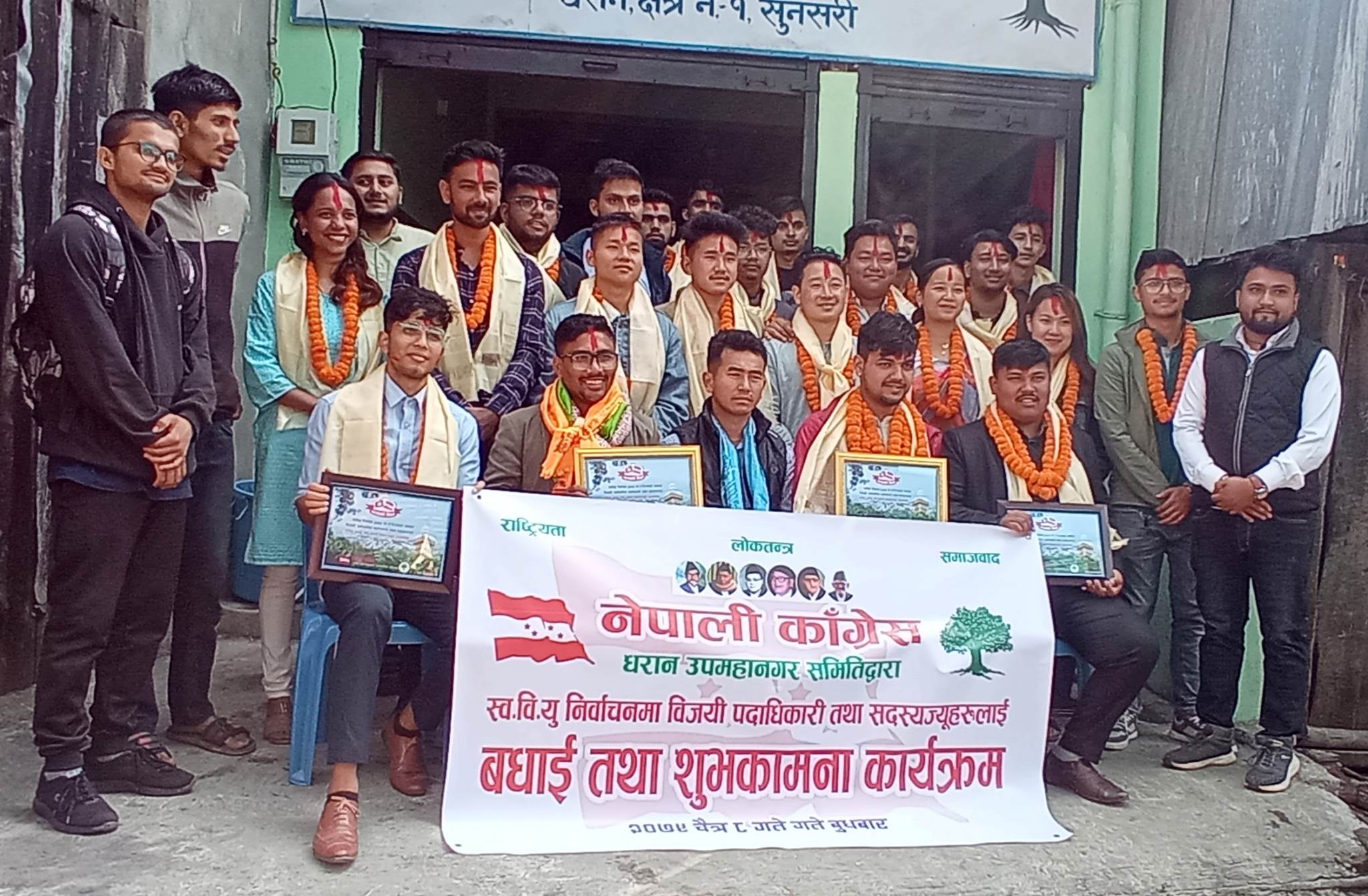 बुधबार नेपाली कांग्रेस धरान नगर समितिले धरानका ४ वटै क्याम्पसबाट निर्वाचित नेविसंघबाट नेतृत्व गरेका विद्यार्थीहरूलाई सम्मान गरेको हो ।
