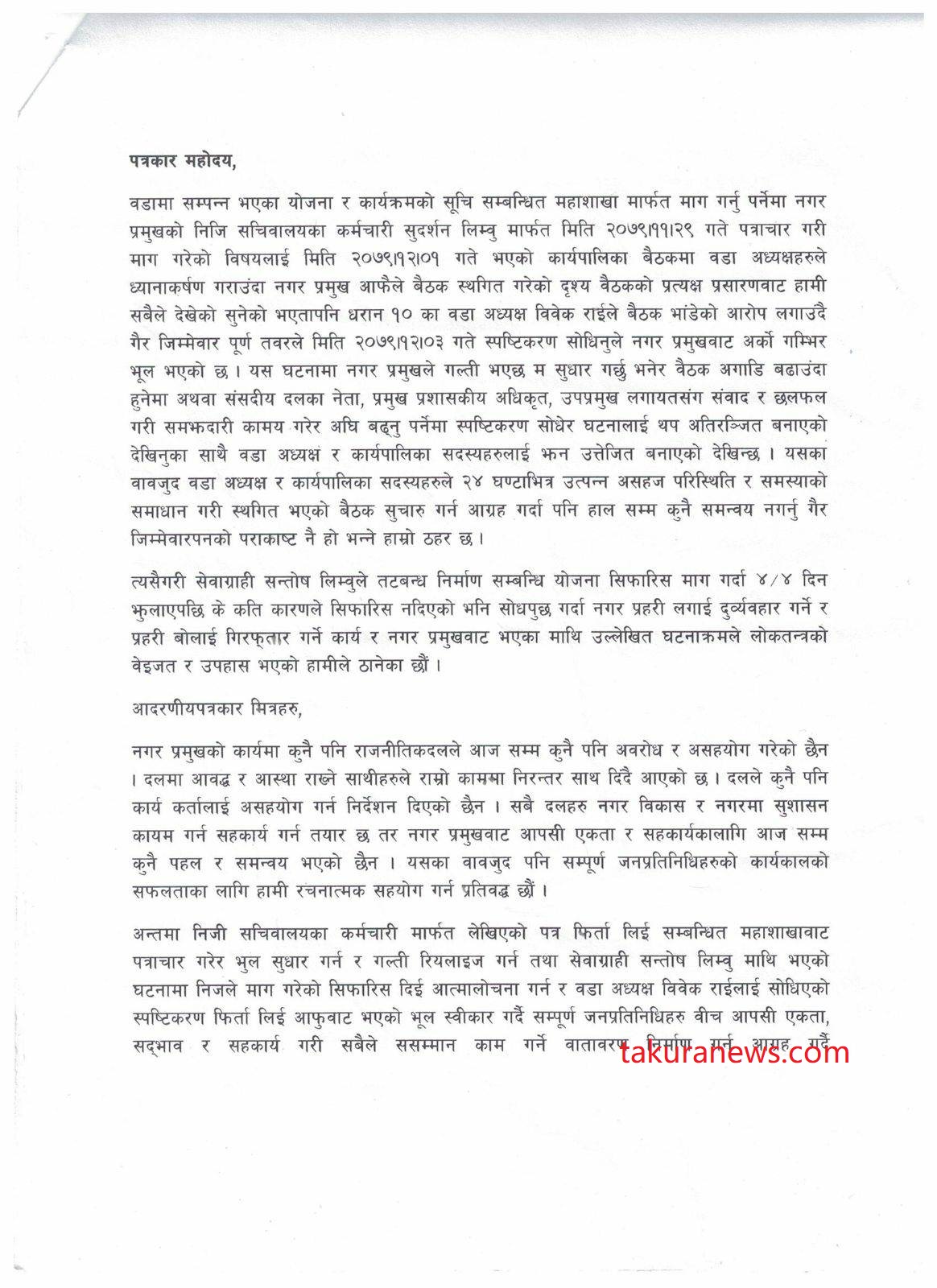 यसैबीच धरानमा रहेका सातवटा विभिन्न राजनीतिक दलले प्रेस विज्ञप्ती जारी गर्दै मेयरले दम्भ देखाएको आरोप लगाएका छन् ।