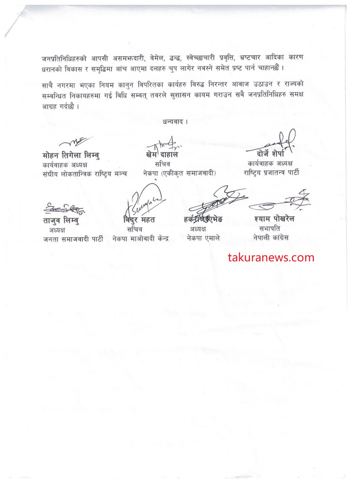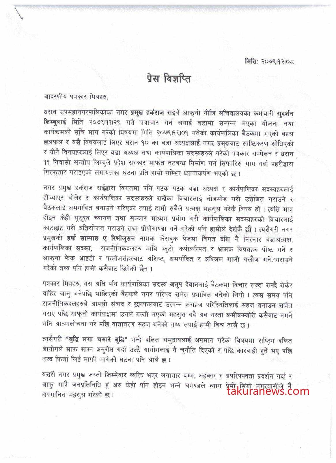 ‘त्यतिमात्र होइन केही युट्युव च्यानल तथा सञ्चार माध्यम प्रयोग गरी कार्यपालिका सदस्यहरूको विचारलाई काँटछाँट गरी अतिरन्जित गराउने तथा प्रोपोगाण्डा गर्ने गरेको कुुरामा हाम्रो असहमति छ,’ विज्ञप्तिमा भनिएको छ, ‘जनप्रतिनिधिबीच आपसी असमझदारी, बेमेल द्वन्द्व, स्वेच्छाचारी प्रवृत्ति, भ्रष्टचारका कारण धरानको विकास र समृद्विमा आँच आएमा दलहरू चुप लागेर नबस्ने समेत प्रष्ट पार्न चाहान्छौं ।’
