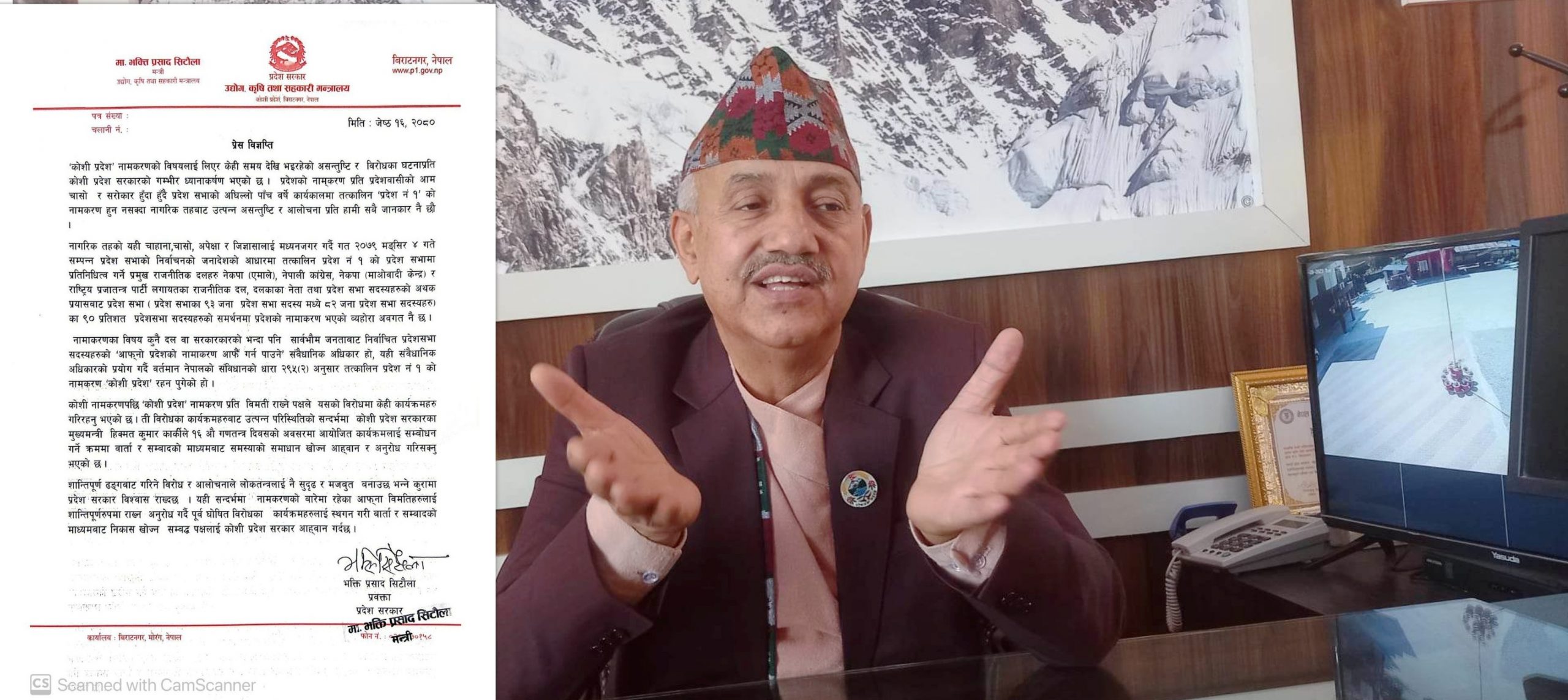 “नामकरणको बारेमा रहेका आफ्ना विमतिहरूलाई शान्तिपूर्णता राख्न अनुरोध गर्दै पूर्व घोषित विरोधका कार्यक्रमहरूलाई स्थगन गरी वार्ता र संवादको माध्यमबाट निकास खोज्न सम्बद्ध पक्षलाई कोशी प्रदेश सरकार आह्वान गर्दछ ।” वक्तव्यमा भनिएको छ ।